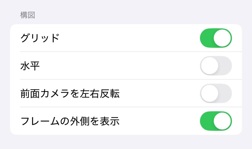 カメラ設定で「グリッド」をONにすると、カメラを起動したときの画面を縦と横を均等に3分割した目安の線を表示してくれます。