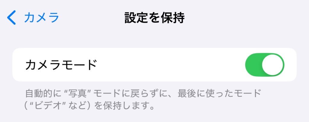この機能をONにすれば、前回使用したカメラモードがそのまま起動されるようになります。
