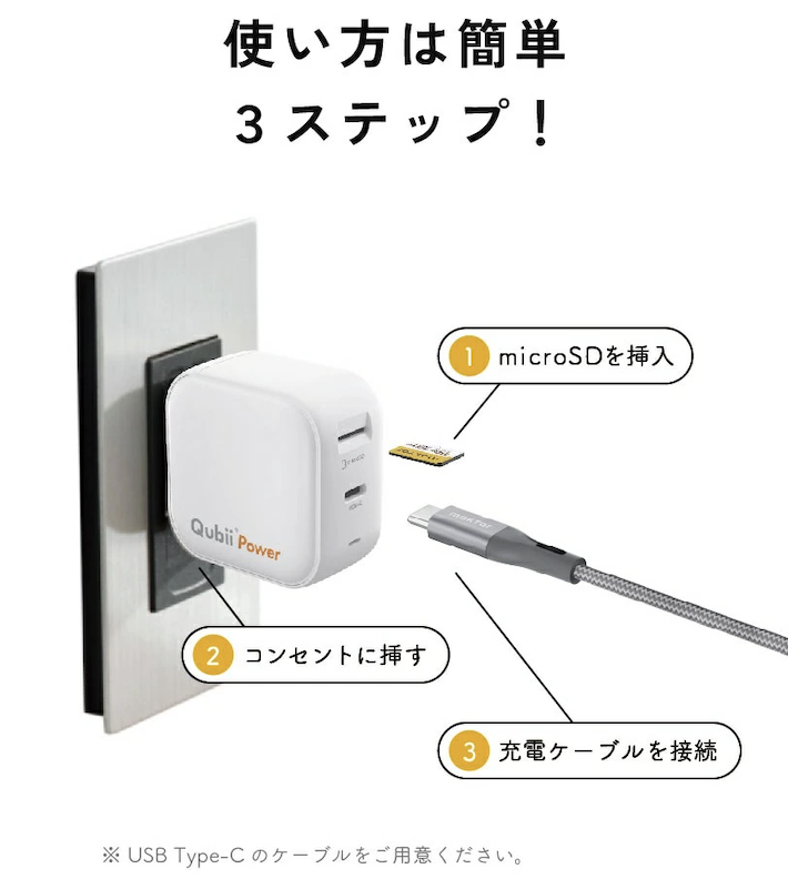 Qubii Powerは充電ケーブルは付属されないため、USB-Cのケーブルを準備しておきましょう。